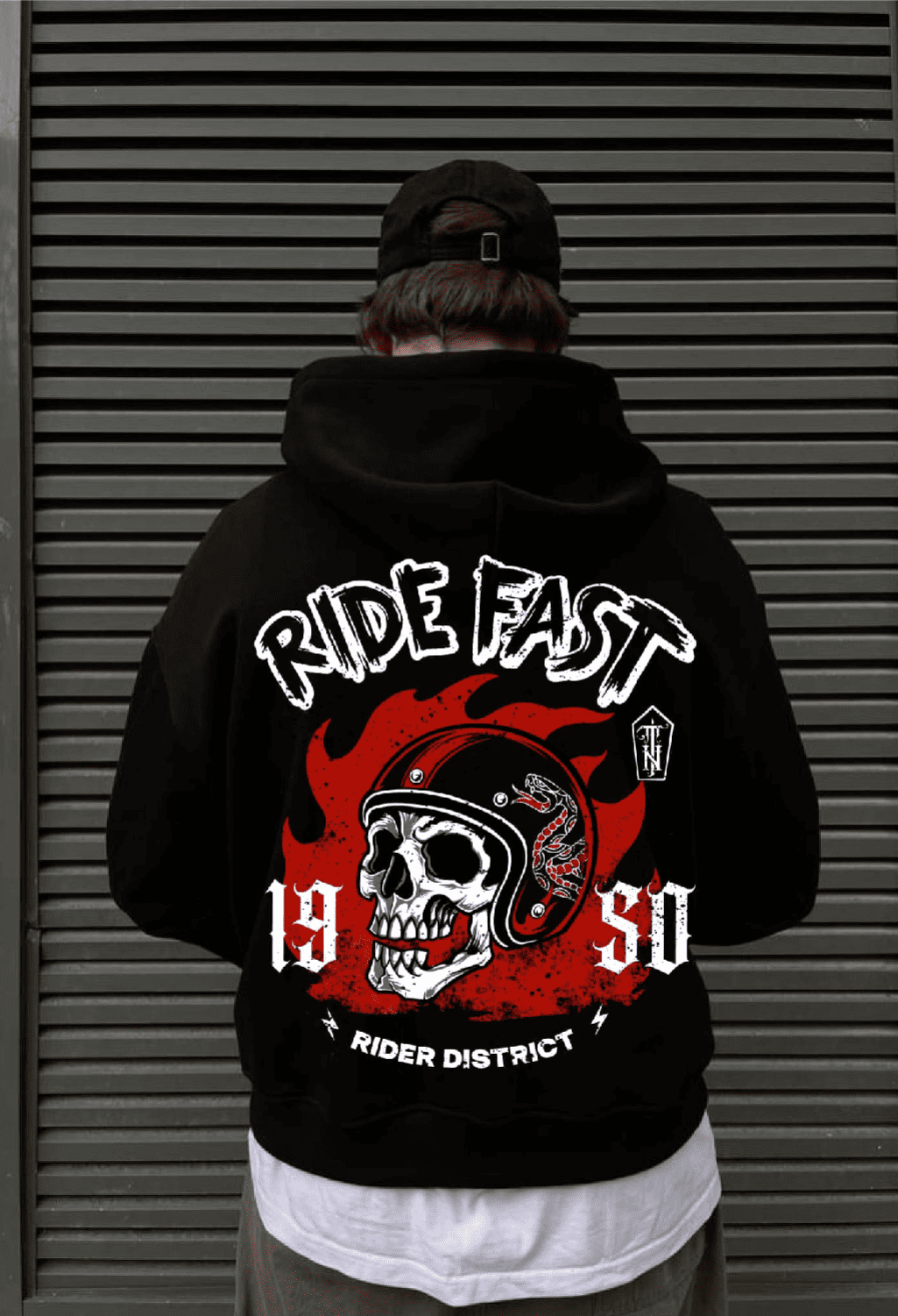 The Details: The “1950” typography and the Rider District branding create a balanced, heritage-inspired look that commands respect.