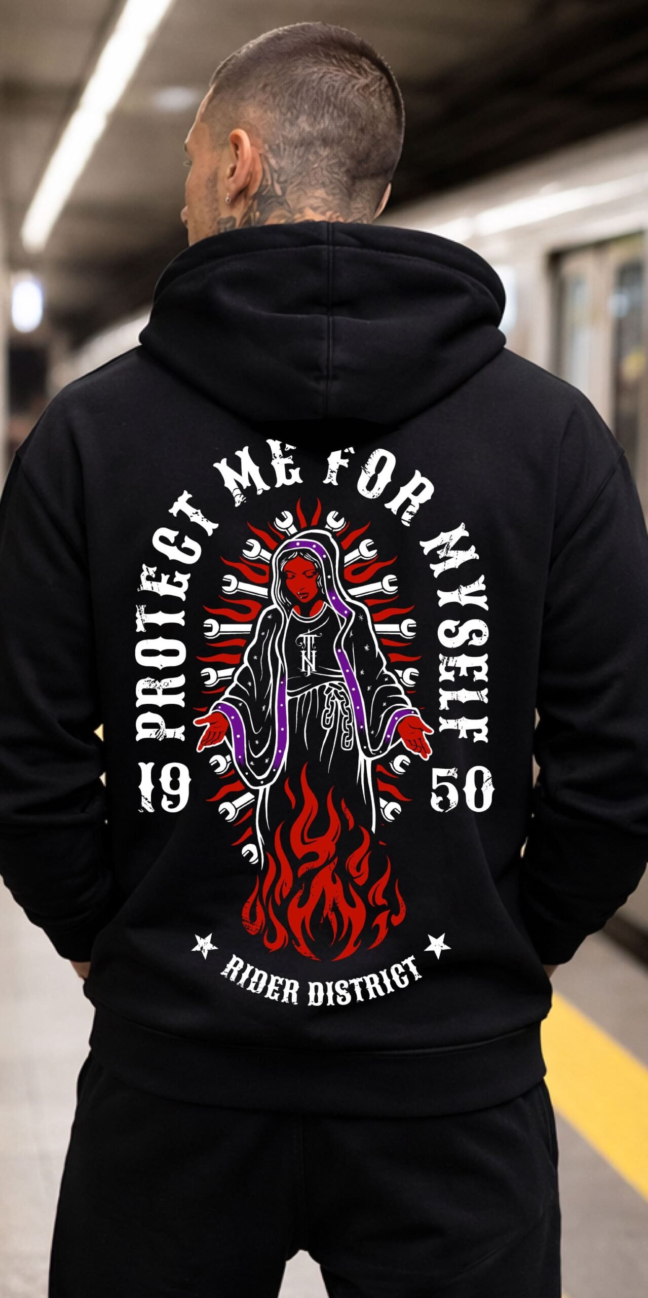 The Rider District “Virgen” Biker Hoodie is a powerful statement of faith, protection, and the internal struggle of every rider. Featuring a bold reinterpretation of classic religious iconography blended with raw garage culture, this hoodie is designed for those who seek a guardian on every journey.