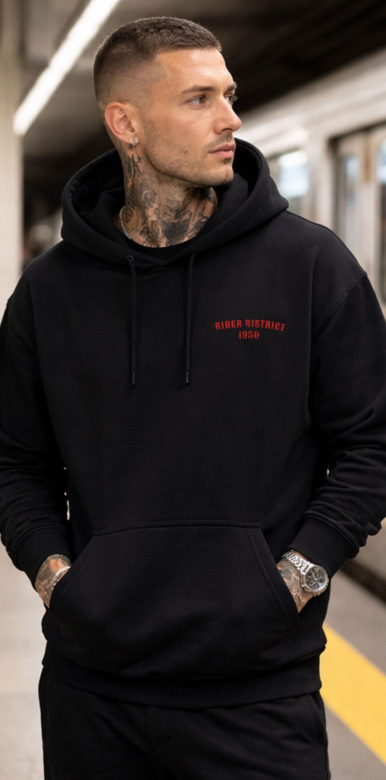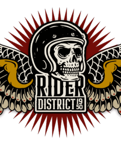 The front features a minimalist “RIDER DISTRICT 1950” logo in a blood-red gothic typeface, providing a clean contrast to the complex, high-detail artwork on the back.